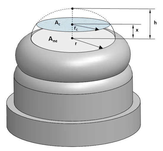 where N is the normal force, is the radius of the contact explained above, is the variable radius, 0 ≤ ≤ , k determines the shape of the pressure profile, and is a coefficient that adjusts for the profile of the pressure distribution over the contact area to satisfy the equilibrium condition.