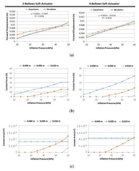 As can be observed in Figure 13a, the two soft actuators exhibit an almost linear behavior and a similar performance to that obtained in the FEM simulations. In addition, it has been experimentally proven that the 2-bellow actuators can reach more force than the 4-bellow actuators, as shown in Figure 13b. Thus, it can be concluded that the thicker the actuator walls are, the more force they can exert due to the input pressure that this actuator can handle. However, if the walls are thinner, then the reliability of the actuator is reduced, even though the displacements may increase. Therefore, the wall thickness should be a variable in the actuator design. This thickness might be different depending on the parts of the actuator in order to take advantage of the chosen geometry. Figure 13c shows how the area increases almost linearly when the object is separated from the actuator by a certain distance. This behavior is because the contact surface is flat, with an area larger than the actuator head. In Figure 13d, the results of the two previous graphs are displayed, where it can be observed that the contact pressure will remain constant due to the conditions of the experiment. During the tests, several behaviors are also observed among actuators of the same type. This finding is due to the manufacturing process, which causes the existence of some bubbles in the actuators. Finally, it can also be deduced from the different experiments carried out that for the same actuator bellows diameter, short bellows tend to behave as cylindrical geometries, which shortens their displacement, while high bellows improve their displacement due to their spherical-like behavior.