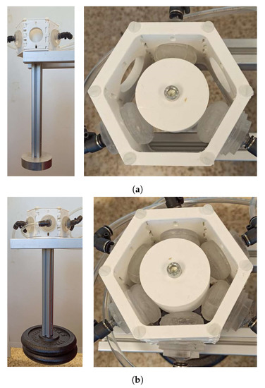 Slip test setup in a hexagonal configuration: (a) Soft gripper with three soft actuators; (b) Soft gripper with six soft actuators.