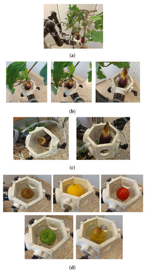 Several tests were also carried out to evaluate the grasping performance, as well as the possible damages produced in real harvested fruits. To that end, a hexagonal configuration gripper endowed with three soft actuators was mounted on one of the Kinova Mico manipulators [78] that make up the ROBOCROP dual-arm robot [79,80] (see Figure 15a). The gripper was tested with 20 artificial aubergines and 25 pieces of real fruits (5 pieces of sweet peppers, pears, lemons, tomatoes and kiwis, respectively) that had reached a stage of sufficient maturity to be edible and be satisfactorily accepted by consumers. Figure 15b displays an example sequence of the harvesting process. The experimental results show that the proposed design is capable of ensuring sufficient contact areas that provide stable grips for different types of fruits, even when the target is not centered on the midpoint of the gripper during the grasping (see Figure 15c). In this last particular case, the grasping is carried out by means of only two actuators. The actual harvested fruits (see Figure 15d) were also carefully observed both after the grasping tests and 24 h later, and no surface damage was detected.