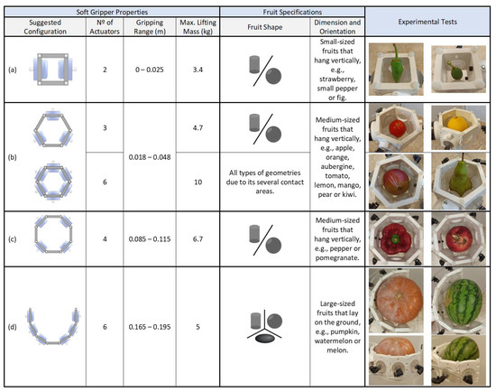 Finally, the proposed design concept allows the soft grippers to be configured with diverse geometries, which makes them fully adaptable not only to different types of fruits and vegetables but also to different manipulation methods. Figure 5 shows several examples of soft grippers obtained from different configurations of the proposed modules.