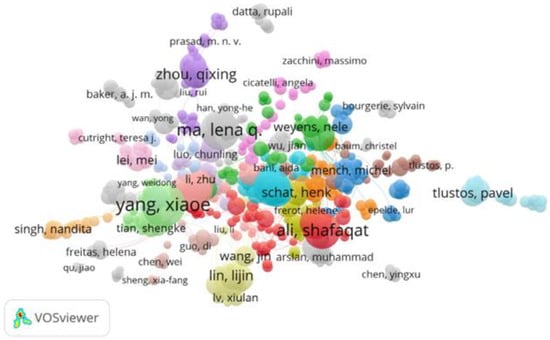 A total of 457 authors met the threshold of a minimum of 10 publications per author. They consisted of 31 clusters in different colors (Figure 2), which indicates that there are 31 closely related groups working on hyperaccumulators for PTE pollution. Among them, Dr. Xiaoe Yang from Zhejiang University (Zhejiang, China) had more international collaborations than the other authors, as indicated by the greatest value of total links (TLS) of 294, followed by Dr. Xun Wang from Sichuan Agricultural University (Sichuan, China) (TLS = 247) and Dr. Yongming Luo from the Chinese Academy of Sciences (Beijing, China) (TLS = 211).