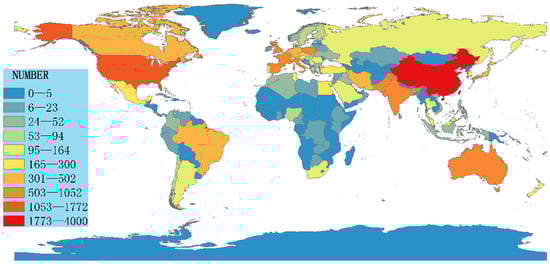 The top 10 organizations and countries are shown in Table 1 and Figure 3. Six of the top 10 institutions were from China, which makes China the most productive country on hyperaccumulator research, with N = 3554 (Table 1). China was followed by the USA (N = 1772) and India (N = 1052). Fewer studies were found from Africa, the Middle East, and South America (Figure 3), but the underlying reason remains unknown. It was noted that the per-article citations (TGCS/N = 51) of the USA were much higher than the other countries. This is also true for the University of Florida (Gainesville, FL, USA), whose TGCS/N (54) was higher than the other top 10 productive organizations.