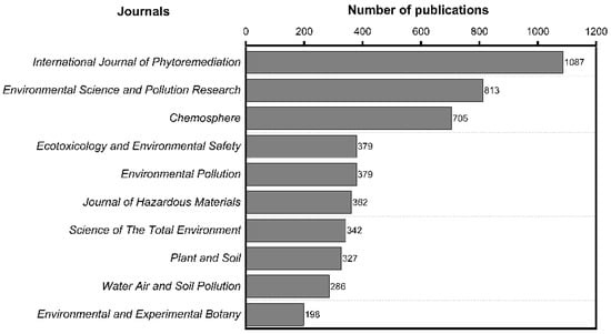 The 13,239 studies on hyperaccumulators were published in 1126 journals, with the top 10 most utilized journals listed in Figure 4. It is understood that most of these journals are related to phytoremediation and environmental pollution. The International Journal of Phytoremediation was ranked No. 1, publishing over 1000 papers on this topic, followed by Environmental Science and Pollution Research (N = 813) and Chemosphere (N = 705).