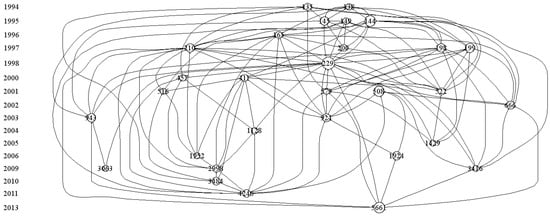 A citation analysis network of the top 30 publications on phytoremediation using HistCite Pro, based on data obtained from the Web of Science Core Collection (WoSCC). On the left is the year, and on the right are publications for the corresponding year. Each circle represents a publication, and the larger the circle, the more citations. The numbers in the circles were given by HistCite Pro. The numbers in the circles and their publications are: 135 [60], 138 [65], 144 [66], 145 [67], 149 [68], 165 [80], 198 [81], 199 [82], 200 [83], 210 [84], 229 [85], 411 [69], 457 [75], 508 [73], 516 [70], 522 [76], 579 [86], 666 [87], 924 [88], 943 [89], 1128 [74], 1429 [90], 1924 [91], 1952 [92], 2998 [71], 3063 [72], 3416 [93], 3484 [94], 4246 [16], and 5661 [8].