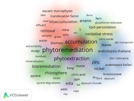Keywords are generally the core of a study and can reveal the research topic in a particular field. The VOSviewer software was used to draw the keyword co-occurrence density map of the 13,239 publications (Figure 6). Phytoremediation was undoubtedly the most frequently used keyword, with over 1000 occurrences. It is not surprising that the terms “phytoremediation”, “phytoextraction”, and “accumulation” stand out in Figure 6, as they are commonly used keywords. Phytoremediation is used to describe the ability of hyperaccumulators to remove PTEs from soil; therefore, terms such as “tolerance”, “removal”, “antioxidant enzymes”, and “rhizosphere” are mentioned repeatedly [75,95,96]. The use of terms for PTE, such as “zinc” [97,98], “cadmium” [74,99], and “copper” [100,101,102,103], as well as hyperaccumulators, such as “thlaspi-caerulescens” [14,104,105], indicates that the phytoremediation of particular metal (i.e., zinc (Zn), cadmium (Cd), and copper (Cu))-contaminated soils has been extensively studied. It should be noted that the keyword co-occurrence density map can only show the hotspots of phytoremediation research in a qualitative way, and it cannot reflect the temporal change, which will be further resolved in the next section.