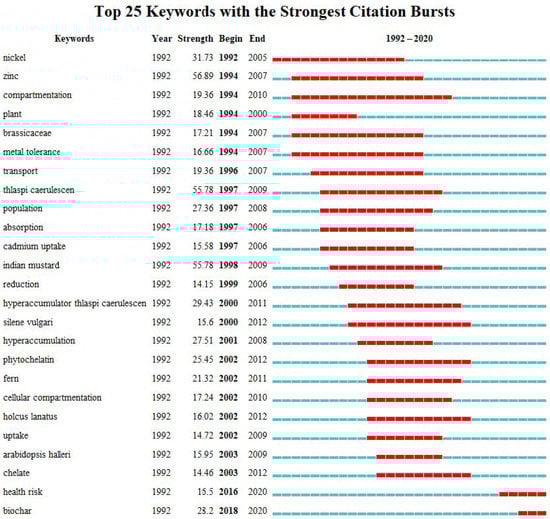 Figure 7 shows the temporal change of frequently appearing keywords or research hotspots with the strongest citation bursts analysis using CiteSpace. The red lines represent the time periods for a keyword with a strong burst. “Nickel”, “zinc”, and “cadmium” were the most-studied PTEs from the 1990s to 2000s. “Metal tolerance” in “plant”, such as “brassicaceae” received widespread attention from 1994 to 2007. The hot topic from 1996 to 1999 was the “uptake” and “transport” of PTEs by “brassicaceae” plants, such as “thlaspi caerulescen” and “Indian mustard”. New hyperaccumulators continued to be discovered, as indicated by “fern” and “arabidopsis halleri” in the 2000s. The concern of PTEs on “health risk” and the applications of “biochar” to remediate soil heavy metal pollution was a hot topic in 2018–2020.
