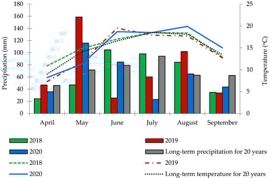 Higher air temperatures were recorded in April and May 2018 compared to long-term data. On the other hand, June was the warmest in 2019 and 2020. July temperatures in each analyzed year were close to the long-term average. In 2020, high temperatures were recorded in August and September. Intensive rainfall was recorded in May 2019 and 2020. Compared to the long-term total, June in 2019 and July in 2020 were dry months (Figure 1).