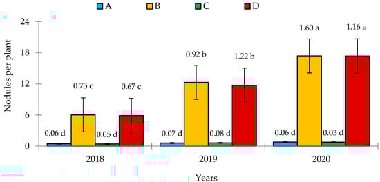 Number of nodules during the flowering stage. A—control (seeds without coating), B—inoculated seeds: HiStick® Soy, C—coated seeds: chitosan + alginate/PEG, D—B + C. Mean values with different letters (a–d) are statistically different at p < 0.001. The numbers on the bars indicate the standard error (SE).