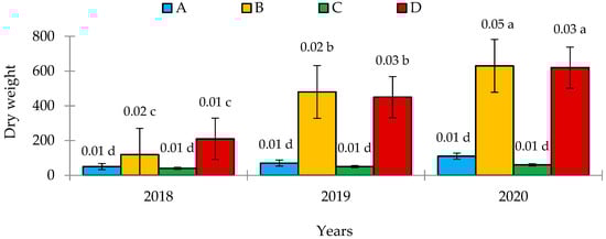 Dry weight of nodules (mg) during the flowering stage. A—control (seeds without coating), B—inoculated seeds: HiStick® Soy, C—coated seeds: chitosan + alginate/PEG, D—B + C. Mean values with different letters (a–d) are statistically different at p < 0.001. The numbers on the bars indicate the standard error (SE).