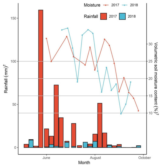 Rainfall (mm) and volumetric soil moisture content (%) situations at Shangzhuang Agricultural Research Station, Beijing, China for the study carried out consecutively in 2017 and 2018 from May to October. † Left and right axes have different scales.