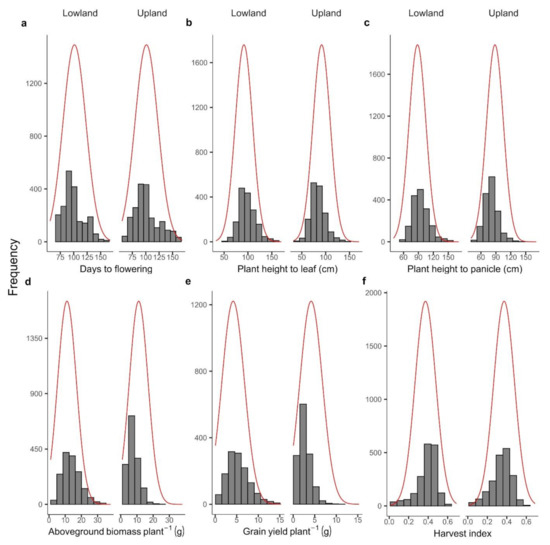 Frequency distribution of the six traits in lowland and upland conditions. Note: (a) Days to flowering. (b) Plant height to leaf (cm). (c) Plant height to panicle (cm). (d) Aboveground biomass plant−1 (g). (e) Grain yield plant−1 (g). (f) Harvest index.