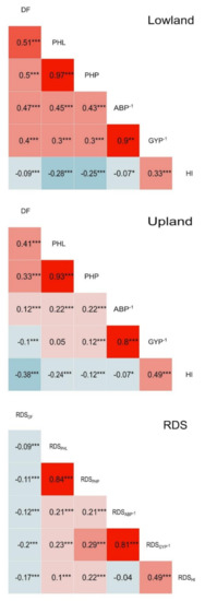 Traits observed in lowland and upland conditions with their respective RDS were subjected to correlational studies. To determine the association of days to flowering, plant height, dry biomass and harvest index, a correlation matrix was implemented with significance based on p-values (Figure 3). There was a mostly high significant relationship in both conditions including RDS. Lowland conditions revealed a strong association among measured traits, followed by upland conditions and RDS. Accessions that had high grain yield under lowland and upland conditions and RDS also had high ABP−1, PHP and HI. PHL showed a high correlation with PHP and DF in lowland and upland conditions, and under RDS except for its negative correlation to DF in RDS. DF, PHL, PHP and ABP−1 denoted a negative relationship with HI in both cultivated conditions indicating that less growth duration imparted better yield. Opposite to this, under RDS, higher HI is attributed to taller plant height, higher ABP−1, and earlier days to flowering.