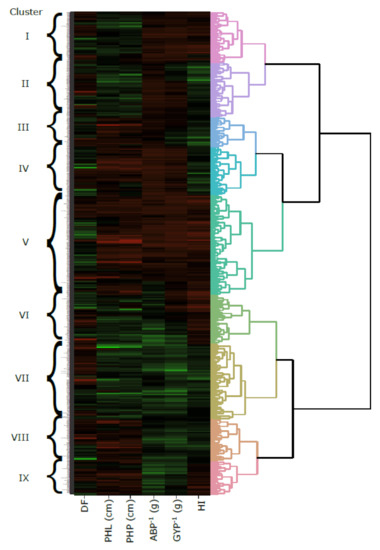 A distance matrix was calculated applying the “Canberra” method using RDS-I of the investigated traits, and cluster analysis was performed to identify grouping among genotypes using the “Ward.D2” [37] hierarchical agglomerative method (Figure 4 and Figure S2). The summary of this analysis is shown in Table 8, while detailed information is provided as Table S2. AHC resulted in nine clusters that were categorized subsequently in four classes, A, B, C and D, regarding drought-resistant performance. The nine clusters and four classes revealed different characteristics responsible for drought stress in different germplasms. The RDS-I of dry biomass and plant height in clusters VII (ABP−1 = 7.43, GYP−1 = 2.20, PHL = 1.76 and PHP = 0.58) and VI (ABP−1 = 6.18, GYP−1 = 5.57, PHL = 2.12 and PHP = 0.81) was lower as compared to the other seven clusters. We concatenated those two clusters in class A (drought-resistant) that possessed drought-resistant genotypes and contained all the genotypes with DRG 1 and 1–3 and the majority of genotypes from DRG 3, 3–5 and 5. On the contrary, class D consisted of clusters III, IV and V whose RDS-I of dry biomass (ABP−1; 19.44 to 26.68 and GYP−1; 5.6 to 8.87) and plant height (PHL; 6.22 to 6.42 and PHP 1.96 to 2.35) was higher in comparison with the other six clusters, and therefore attributed as a drought-susceptible class. Between class A and D, class B covered clusters VIII and IX that were just opposite to class C (clusters I and II). The RDS-I for dry biomass was lower, and that of plant height was higher in class B, hence drought resistance ranged from moderate (DRG 5) to strong (DRG 3–5 and 3), whereas RDS-I for dry biomass was higher, and that of plant height was lower in class C, which resulted in weak drought resistance among most of the genotypes in that class, with mostly DRGs 7, 5–7 and 9.