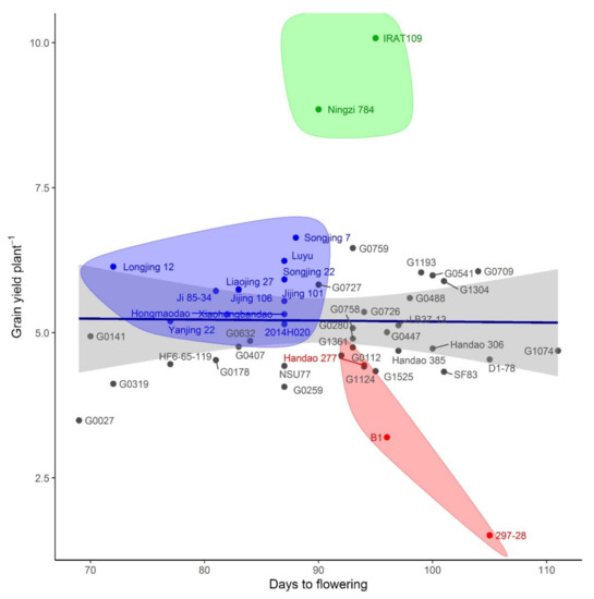 Furthermore, to visualize the relationship of grain yield to growth duration under drought stress, a scatter plot of those 45 genotypes (controls involved) was drawn (Figure 5) with yield plant−1 on x-axis and days to flowering on the y-axis. Two groups among those genotypes were marked for better yield and fewer days to flowering. IRAT109 and Ningzi 786 were elite accessions while Longjing 12, Xaiohongbandao, Ji 85-34, Hongmaodao, Yangjing 22, Jingjing 106, Liajing 27, Songjing 7, Luyu, Songjing 22, Jijing 101 and 2014H020 were attributed with better yield and shorter growth duration. Selected genotypes distinctly expressed better performance from controls particularly from B1 and 297-28. Susceptible control positioned at right bottom of the graph with more number of DF together with less GYP−1. However, there was a slightly negative relationship between DF and GYP−1 which was somewhat according to the correlation among the same traits when it was calculated for the whole germplasm.