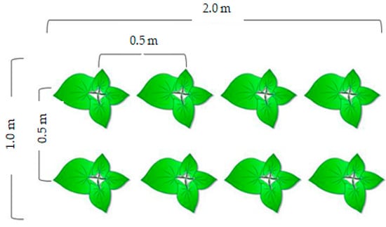 Two days before transplanting, 1-m strips of black PE film were spread over the soil surface. Immediately before transplanting, the substrate in all pots was saturated with water to facilitate the removal of roots. Eight seedlings were planted per plot, at a spacing of 0.5 × 0.5 m. In plots mulched with black PE film, openings were made by crosswise incisions, and seedlings were planted in the openings. After transplanting, 2.5-wide strips of PE film and non-woven PP fabric, stretched over metal arcs, were used for covering two rows of tomatillo plants. The height of the plastic tunnel was 40 cm. The edges of the covers were buried in soil to prevent the plastic from being blown away by the wind. New covers were applied each year. Strips of bare soil, 0.5 m wide, were left between strips of PE film and non-woven PP fabric to enable rainwater to soak into the soil. Plot size for harvest was 2 m2 (Figure 2). The covers were removed when the first flowers appeared on plants. Flowering began 55 days after sowing (14 June) in 2015, 43 days after sowing (7 June) in 2017, and 49 days after sowing (11 June) in 2018. The main agronomic treatments in tomatillo cultivation are presented in Table 2.