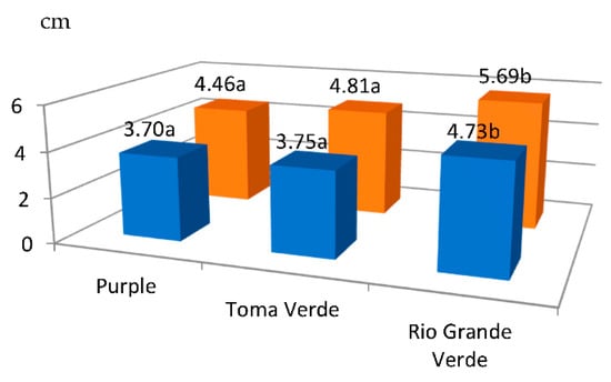A statistical analysis demonstrated that the average vertical and horizontal diameters of tomatillo fruit, determined for the three-year study, were significantly affected only by cultivar, ranging from 3.70 cm in cv. ‘Purple’ to 4.73 cm in cv. ‘Rio Grande Verde’ (Figure 4). The fruit of cv. ‘Rio Grande Verde’ was characterized by the largest horizontal diameter (5.69 cm). According to the Mexican Standard NMX-FF-54-1982, the analyzed tomatillo fruit belonged to class A.