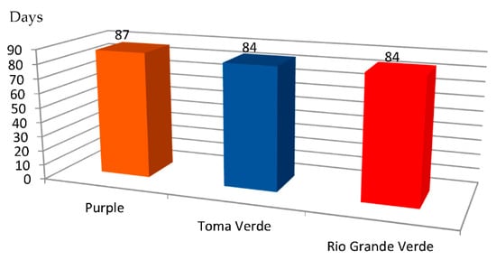 The number of days between transplanting seedlings to the first harvest of tomatillo fruit varied across years and ranged from 80 to 94 (Figure 5, Figure 6 and Figure 7). During the three-year study, the fruit of cvs. ‘Rio Grande Verde’ and ‘Toma Verde’ ripened faster (84 days) than the fruit of cv. ‘Purple’ (Figure 5). The fruit of cvs. ‘Toma Verde’ and ‘Rio Grande Verde’ grown under protective covers in mulch were harvested earlier.