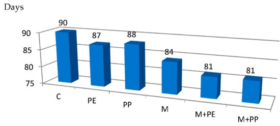 The effects of plant covers and soil mulching on the number of days between transplanting seedlings to the first harvest of tomatillo fruit) (means of 2015, 2017–2018) (means of 2015, 2017–2018). Explanation: C—control; PE—perforated PE film with 100 openings per m2 for covering field beds (PE); PP—non-woven PP fabric with surface density of 17 g m−2 for covering field beds; M—black PE film with a thickness of 0.05 mm for mulching; M + PE—black PE film with a thickness of 0.05 mm for mulching + perforated PE film with 100 openings per m2 for covering field bed; M + PP—black PE film with a thickness of 0.05 mm for mulching + non-woven PP fabric with surface density of 17 g m−2 for covering field beds.