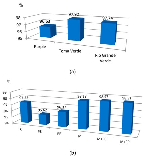 The effects of cultivar (a), plant covers and mulching (b) on the marketable yield of tomatillo fruit expressed as a percentage of total yield (means of 2015, 2017–2018). Explanation: C—control; PE—perforated PE film with 100 openings per m2 for covering field beds (PE); PP—non-woven PP fabric with surface density of 17 g m−2 for covering field beds; M—black PE film with a thickness of 0.05 mm for mulching; M + PE—black PE film with a thickness of 0.05 mm for mulching + perforated PE film with 100 openings per m2 for covering field bed; M + PP—black PE film with a thickness of 0.05 mm for mulching + non-woven PP fabric with surface density of 17 g m−2 for covering field beds.