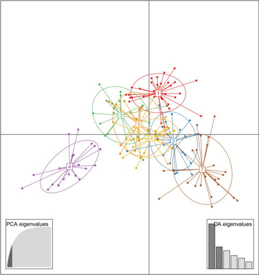 - Jombart, T. Adegenet: A R package for the multivariate analysis of genetic markers. Bioinformatics 2008, 24, 1403–1405. [Google Scholar] [CrossRef] [PubMed] [Green Version]