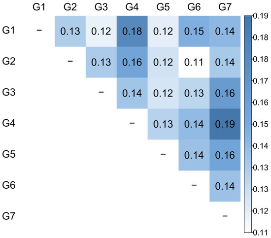 To validate the genetic differentiation among the seven groups, the FST values based on Nei’s genetic distance among groups were determined (Figure 3). The overall pairwise FST values of 0.14 suggested a moderate differentiation between groups and varied from 0.11 (between G2 and G6) to 0.19 (between G4 and G7). Most of the groups with paired G4 exhibited higher FST values than the other pairs. All of these comparisons had non-zero lower and upper 99% confidence intervals (Supplementary Materials, Table S2).