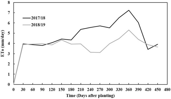 Evapotranspiration-ETo (mm/day) of cassava canopy at Zambia Agricultural Research Station (ZARI) in Mansa during two experimental seasons (2017/18 and 2018/19 season).