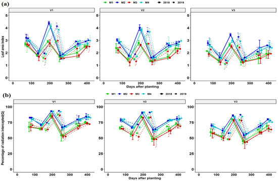 Leaf area index (a) and fraction light interception (b) dynamics of different cassava varieties as affected by different fertilizer regimes. Key: M1 = lime application only, M2 = fertilizer and lime, M3 = no fertilizer and no lime (low input farmer practice) and M4 = fertilizer application only. V1 = Mweru, V2 = Bangweulu and V3 = Katobamputa during the two agricultural seasons 2018 and 2019.