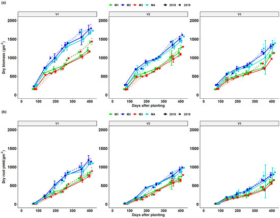Biomass (TDM—total dry matter) (a) and root yield (RDM—root dry matter) (b) dynamics of different cassava varieties as affected by different fertilizer regimes. Key: M1 = lime application only, M2 = fertilizer and lime, M3 = no fertilizer and no lime (low input farmer practice) and M4 = fertilizer application only. V1 = Mweru, V2 = Bangweulu and V3 = Katobamputa during the two agricultural seasons 2018 and 2019.