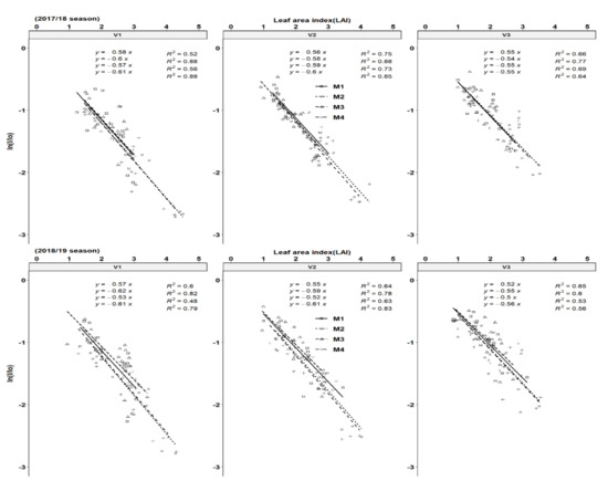 An illustration of cassava canopy extinction coefficients (K) of cassava genotypes. Each slope corresponds to radiation use efficiency (RUE) according to treatment effects for different harvesting periods for the 2017/18 and 2018/19 seasons, respectively. Key: M1 = lime application only, M2 = fertilizer and lime, M3 = no fertilizer and no lime (low input farmer practice) and M4 = fertilizer application only. V1 = Mweru, V2 = Bangweulu and V3 = Katobamputa.