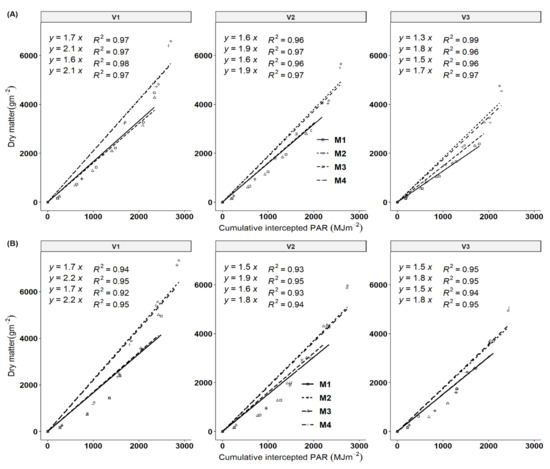Radiation user efficiency (RUE) for different treatment combinations was calculated as a slope of the linear regression of total plant biomass (gm−2) and cumulative intercepted radiation (IPAR) (MJm−2) during different times of growing seasons [22,39,40]. In this study, it was assumed that 45% of daily solar radiation (DTR) was photosynthetically active radiation (PAR)