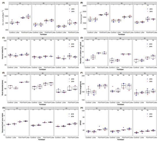 Box plots of (A) root yield and (B–G) are cassava yield components, and (H) is green canopy trait of mean values per genotype and season (2018 and 2019) for the different fertilization regimes M1 = lime only, M2 = Fertilizer + Lime, M3 = no fertilizer, no lime (traditional low resource farmer management), M4 = Fertilizer only, V1 = Mweru, V2 = Bangweulu, V3 = Katobamputa. Significance codes are indicated for different treatment effects as 0 ‘***’ 0.001; ‘**’ 0.01; ‘*’ 0.05, ns: not significant above boxplots within the figure.