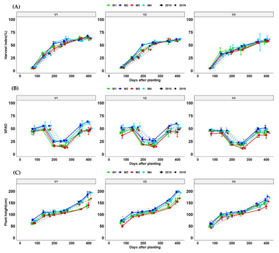 Line plots dynamics of (A–C) are: harvest index (%), SPAD and plant height (cm) are cassava yield components of mean values per genotype at different fertilizer treatments management options. M1 = liming only, M2 = Fertilizer + lime, M3 = no fertilizer, no lime (traditional low-resource farmer management) and M4 = fertilizer only for two seasons (2018 and 2019). V1 = Mweru, V2 = Bangweulu, V3 = Katobamputa are cassava genotypes (clones).