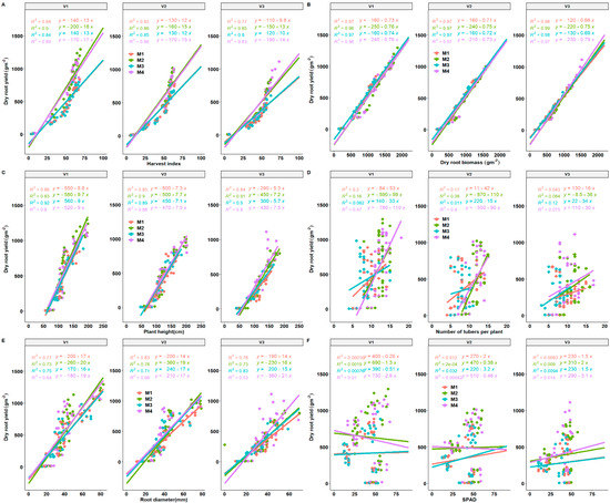 Regression plots between dry root yield and selected yield components (A–F) present correlations of dry root yield versus HI (harvest index), biomass, plant height, number of tubers per plant, root diameter and SPAD. M1 = lime only, M2 = fertilizer + lime, M3 = no fertilizer, no lime (traditional low resource farmer management), M4 = fertilizer only as different fertilization regimes. V1 = Mweru, V2 = Bangweulu, V3 = Katobamputa are different varieties.