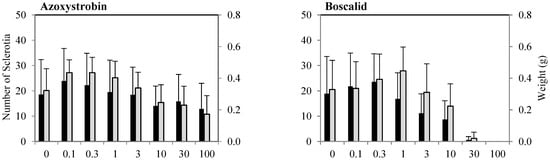 Effect of different fungicides on sclerotia formation (black bars) and the weight of them (grey bars). To evaluate the inhibitory effect of five fungicides as well as a biopesticide on production of sclerotia of S. sclerotiorum (n = 68) in-vitro, potato dextrose agar (PDA) was amended with the fungicides at seven concentrations. Plates incubated in 25 °C in darkness for 21 days for sclerotia formation. Each column indicate mean value ± standard deviations (error bars).