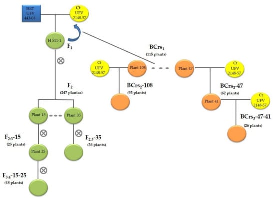 After confirming marker efficiency, 1 plant from the F2:3-15 population and 1 BCrs2-47 plant resistant to H. vastatrix were selected to generate the F3:4 population (F3:4-15-25) with 48 plants and the BCrs3 population (BCrs3-47-41) with 26 plants. The crosses were performed at the Universidade Federal de Viçosa (UFV), Minas Gerais (Figure 1).