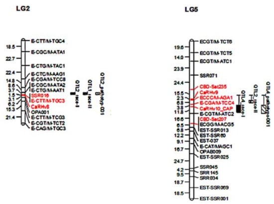 The results confirmed the mapping of the developed markers close to their respective AFLP markers. CaRHv8 maintained the same linkage order and was mapped at 3.0 cM from the original AFLP ECTT/MTGC3 in LG2. CaRHv9 was mapped at 2.3 cM from the AFLP ECCC/MAGA1, while CaRHv10_CAPS was mapped at 3.8 cM from the AFLP ECGA/MTCC4 in LG5. CBD-Sat207 and CBD-Sat235 were in LG5, flanking the QTL related to CRL resistance (Figure 2).
