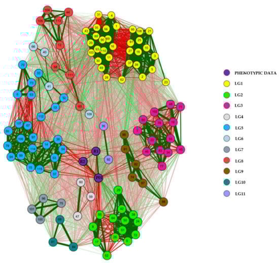 To confirm marker grouping in the genetic map and the location of QTLs of CLR resistance, correlation analysis using molecular data of all markers and phenotypic data of coffee plant resistance to the three H. vastatrix pathotypes (race I, race II, and pathotype 001) was performed. The correlation network confirmed the formation of 11 LGs on the C. arabica genetic map, which represents the basic number of chromosomes of the species (x = 11) (https://www.ncbi.nlm.nih.gov/genome accessed on 15 July 2021) [,]. As such, LG2 and LG5 marker data were correlated with phenotypic data, corroborating the presence of two independent CLR resistance loci in these LGs.