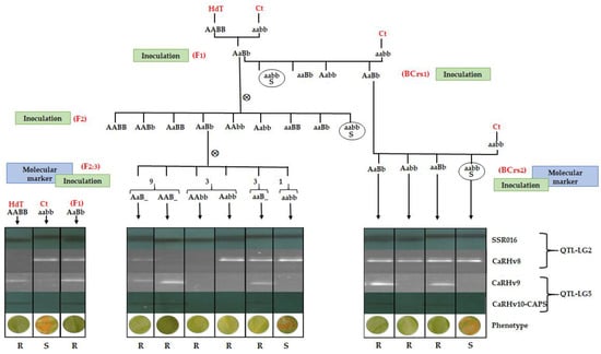 Since we could not successfully convert CaRHv7 in a polymorphic marker, the marker SSR016 [], which is closely linked to it, was used to monitor QTL-LG2. Accordingly, both QTLs were monitored using a primer-specific marker; QTL-LG2 was flanked by SSR016 and CaRHv8 and QTL-LG5 by CaRHv9 and CaRHv10_CAPS.