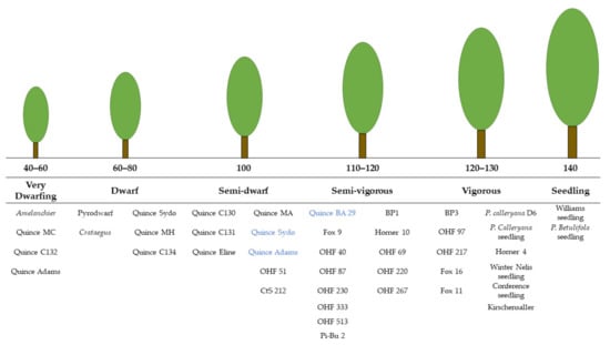 For the European pear, it is possible to distinguish two main groups of rootstocks: the quince (Cydonia oblonga Miller), used mainly in Europe, and the pear rootstocks (Pyrus communis L.), mostly obtained from seed or clones, which are mainly widespread in USA, South Africa, and South America, while their use in Europe is primarily limited to Williams [12,15,20,21,22] (Figure 1, Table S2, Appendix A).