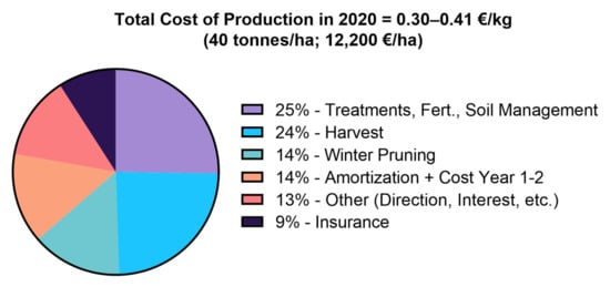 Production cost has always been an important factor of competitiveness for fruit growers. This is even more important in the scenario of the last two decades, since the prices perceived in the main producing countries of Europe, in general, cannot compensate for the production costs. To give an example of a cost partitioning, the data corresponding to Conference and Abbé Fétel cultivars in a traditional bi-axis orchard in the Ebro Valley Spain are exposed in Figure 2. The labor represents 38% as the main cost (harvest and winter pruning), followed by crop protection, plant phytoregulators, and soil cover crop management (25%) (Figure 2). These data show that by increasing the efficiency in the use of labor and crop protection, the cost could be significantly reduced. The remaining costs (direction, amortization, insurance, etc.) are more difficult to reduce and are not related to the use of inputs. In this case, the total cost of planting is 20,500 €/ha and 35,000 €/ha with hail net protection.