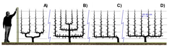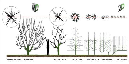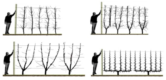 This change, from volume or tri-dimensional canopies to planar or bi-dimensional canopies, has been linked to a progressive reduction of the spacing through the intensification of the orchards. Several authors reported this intensification as key for the efficient use of inputs in current and future fruit production [35,46]. Considering planar canopies, different options have been developed or are being developed in several countries, and are mostly based on bi-dimensional tree architecture. Several examples of these intensive and bi-dimensional training systems are illustrated in Figure 4.