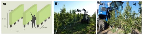 This system originally has been developed in olive, almond, peach, and plum [42,43], when the fruit destination is for processing or industry. In Spain, several producers from the Ebro Valley show interest in this system [59]. The objective is to utilize a hedger in orchards with a planting distance ranging from 3.0 to 3.5 m between the rows and from 1.0 to 1.3 m in between trees, as illustrated in Figure 6A. After planting, the unproductive period is reduced to two years, achieving full yield (40–45 t ha−1 with cv. Williams) in the fifth or sixth year, depending on the variety. The pruning is then performed only mechanically once per year (Figure 6B). During the formation period, the green pruning (lateral and/or topping) will be applied 2–3 times per year, depending on the cultivar. Harvest can be performed mechanically (Figure 6C).