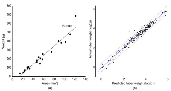 Tuber area vs. weight. Tuber area was calculated using ImageJ and compared to tuber weight. (a) individual tuber weight vs. area. (b) prediction model for tubers harvested from a single plant grown in the greenhouse. Dashed lines indicate 95% prediction interval.