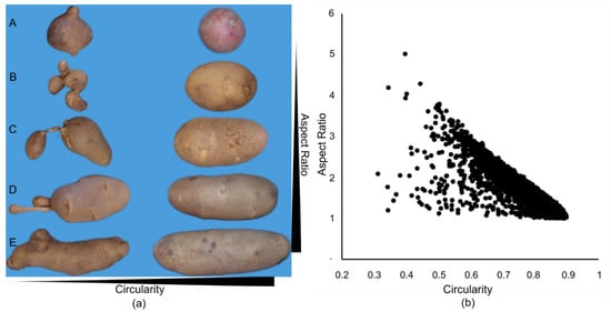 Aspect ratio versus circularity. (a) example tubers with ascending aspect ratio and circularity. (b) aspect ratio versus circularity plot for individual tubers.
