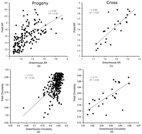 Greenhouse versus field grown tuber shape properties. (a) progeny AR, (b) progeny circularity, (c) cross AR, (d) cross circularity.