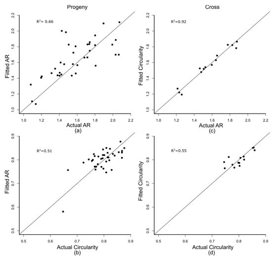 Predicted vs. actual shape values. A prediction model using measurements on greenhouse grown tubers was generated and predicted values were compared to measurements on field grown tubers. (a) Predicted progeny AR based vs. actual progeny AR. (b) Predicted progeny circularity vs. actual progeny circularity. (c) Predicted cross AR vs. actual cross AR. (d) Predicted cross circularity vs. actual cross circularity.