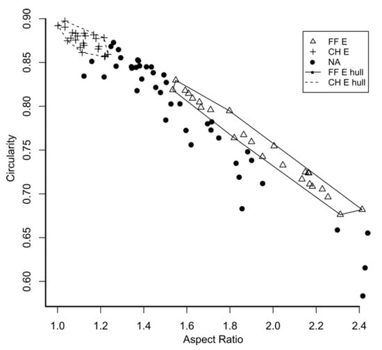 When designing crosses, the breeding evaluation team pre-determined which market class a given cross was destined for. Using the shape prediction models from greenhouse grown tubers described previously, we determined whether the mean predicted field values for AR and circularity fell within the Excellent category for the destined market category. For both the predicted values based on greenhouse derived models and actual field derived measured values we determined whether the mean fell within or outside the Excellent hulls for French fries or chips. We then calculated the model accuracy as the percentage of agreement between the predicted Excellent calls from the greenhouse derived models vs. the actual Excellent calls derived from field measurements (Table 2). For the chipping market our prediction model had an accuracy of 85.7% and the French fry prediction model had an accuracy of 75.5%.
