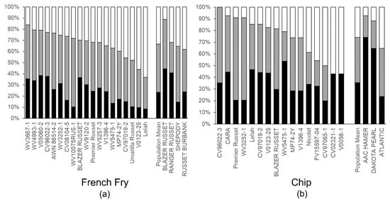 Proportion of Excellent (black), Acceptable (grey) and Not Acceptable (white) tubers derived from parents in the crossing population. (a) French fry market class. (b) Chip market class.