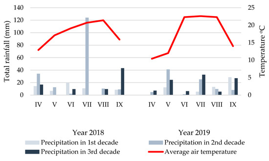 The weather data for characteristic of weather conditions in years of study came from the measurement station located in Brody. The local climate is classified as temperate. It is characterised by mutual influence of maritime and continental climates. It has a seasonal, transitional, and changeable nature, especially in summer [58]. The average air temperature for the period 1960–2017 was 8.4 °C, while the average rainfall was 603.1 mm·m2. It was noted that the weather conditions were diverse in the study period, especially regarding the amount and distribution of rainfall [Figure 1]. In the first year (2018) mean air temperature was 9.8 °C and was higher by 1.4 °C than the long-term average temperature. Annual sum of precipitation in 2018 was 444.1 mm·m2 and was lower by 161.7 mm·m2 than sum from the long-term period. The amount and distribution of rainfall in the growing season 2019 was more favourable for plant growth compared to the previous year.